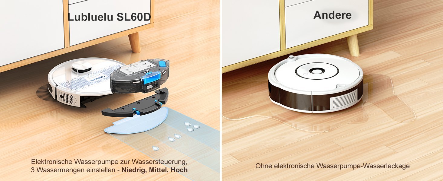 Lubluelu Saugroboter   wird für seine intelligente elektronische Wasserpumpe und die dreistufige Wassermengenregulierung bewundert. Deshalb ist unser Staubsaugroboter ein fester Bestandteil Ihrer täglichen Bodenreinigung, er wird Ihnen helfen, sich von lästiger Hausarbeit zu befreien.